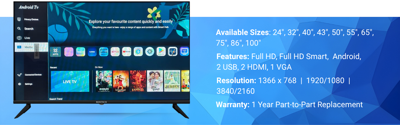 Reintech Electronics Pvt. Ltd. is a Noida-based OEM manufacturer specializing in high-quality LED TVs. Established in 2018, the company offers a wide range of LED TVs—from HD to 4K Smart Android models – catering to brands seeking private-label solutions.